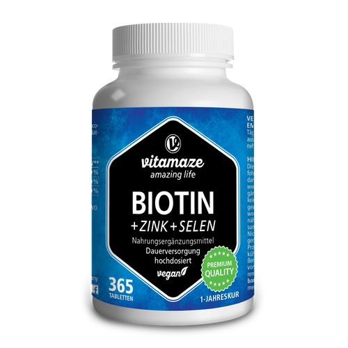 Biotin 10,000 mcg v nejoptimálnější kombinaci se zinkem a selenem pro hezkou pleť, růst vlasů a silné nehty. 365 veganských tablet na 12 měsíců. Biotin ve vysokých dávkách, zinek a selen: Nezbytné živiny samy o sobě, dohromady nepřekonatelná kombinace pro pleť, růst vlasů a nehty! Biotin (vitamin B7) a dva stopové prvky podporují přirozený růst v té nejlepší kvalitě – a v obvyklé kvalitě Vitamaze. 3 aktivní složky pro zdravý vzhled: Jednotlivé složky jsou důležité pro různé procesy v těle. Ideální kombinace aktivních složek: Tablety Vitamaze obsahují vysoké dávky biotinu v kombinaci se zinkem a selenem. Tím se kompenzují stávající nedostatky a zároveň lze vyloučit předávkování. Jednou denně: 365 veganských tablet biotinu na 12 měsíců – stačí užívat jedenkrát denně a představuje tak ideální denní dávku. Pro ženy a muže: Kombinace aktivní složky biotinu ve vysoké dávce + zinek + selen může pomoci také mužům, například při růstu vousů a vlasů. Obsahuje: 365 tablet. Sensilab/Vitamaze